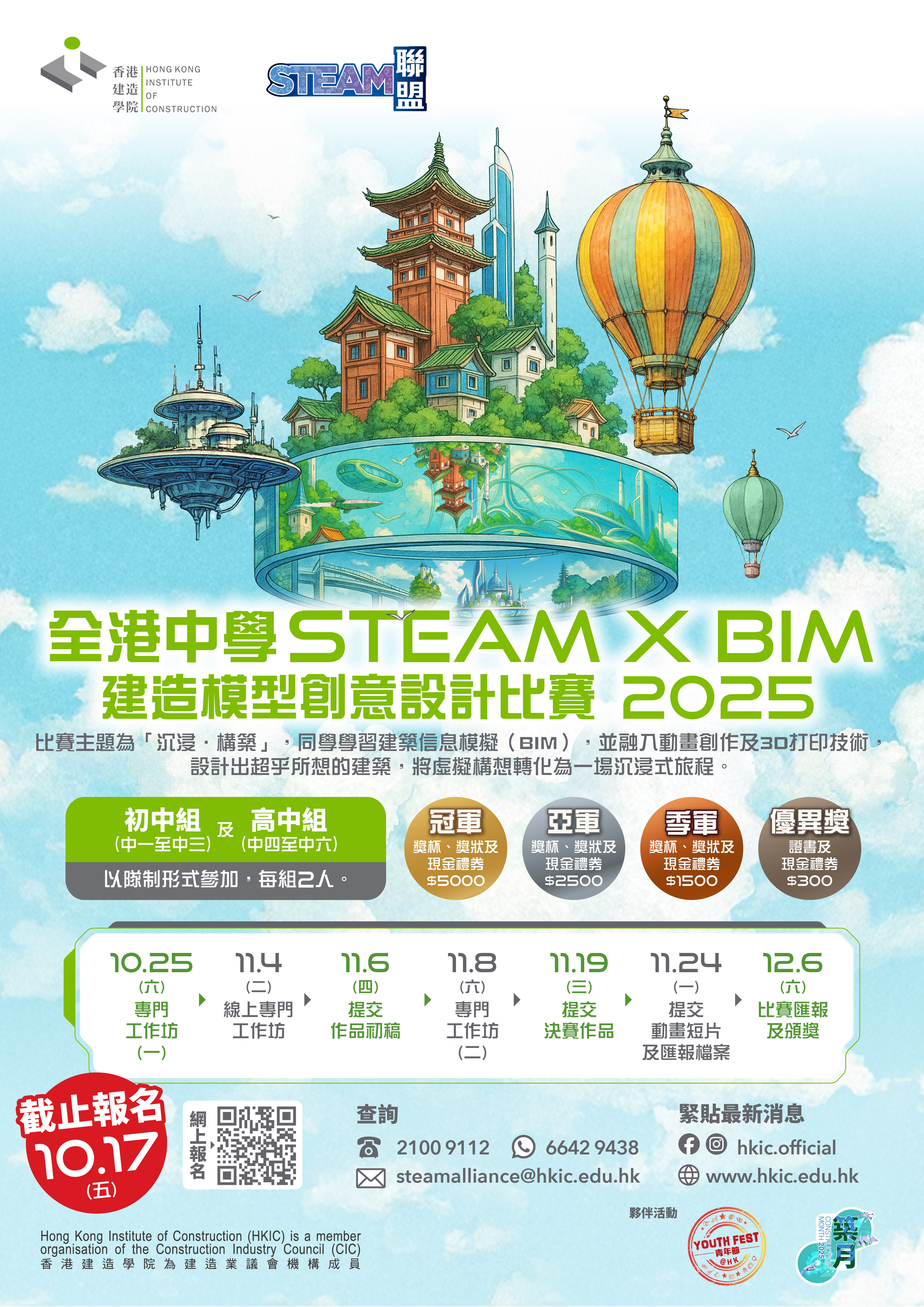 For enquiries regarding this event, please contact the Hong Kong Institute of Construction ‘STEAM Alliance’ Secretariat (Tel: 2100 9112 Ms Choi / 2100 9111 Ms Chan; WhatsApp: 6642 9438).