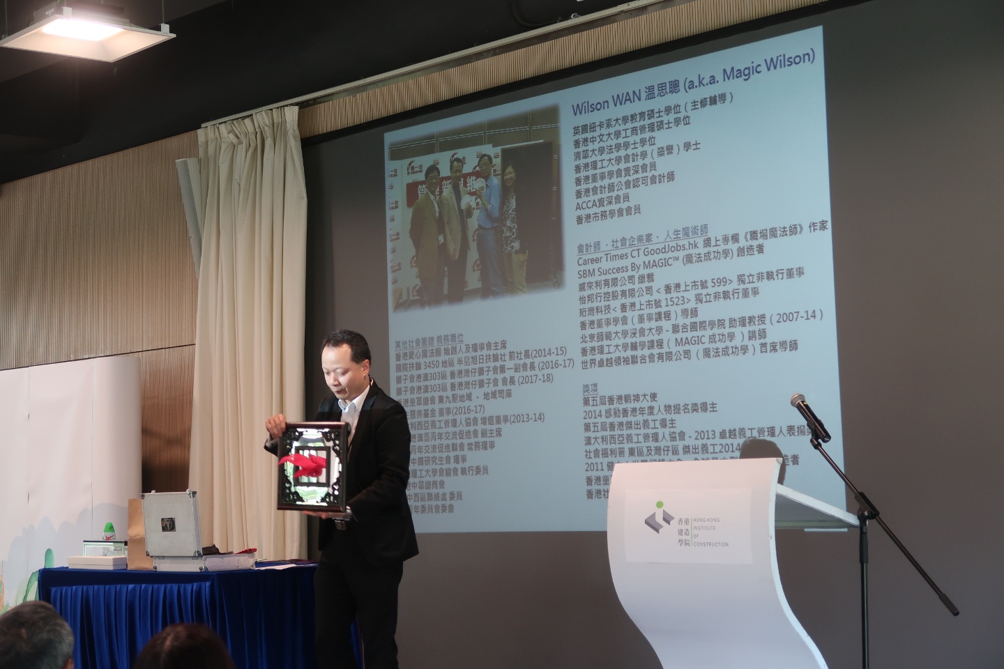 香港愛心魔法團理事會主席温思聰先生 (Magic Wilson) 於9月30日香港建造學院全人發展講座,透過魔術分享積極正面解讀人生,近150名建造文憑以及高等文憑同學參與。Wilson在踏上成功路前曾經面對人生幾個低谷,包括大學未能入到心儀學科、工作、創業,家人同自己的健康相繼出現問題,面對逆境但他都無放棄,並作多方面嘗試。及後受到「少林足球」的啟發,將魔術融入培訓中,衝出另一片天。活動上特別感謝他在中學時的一位老師為他寫求情信讓他可以繼續學業,該老師就是香港建造學院管理委員會成員李永良校長了!李校長都有出席全人發展講座, 能在恩師面前表演魔法同分享,心情特別興奮。 Wilson 覺得魔術和建築大廈十分相似,由無變有,他還勉勵大家「創新求變,由心出發,樂在其中」,發揮自己的優點,找到自信,繼而選擇適合自己的事!