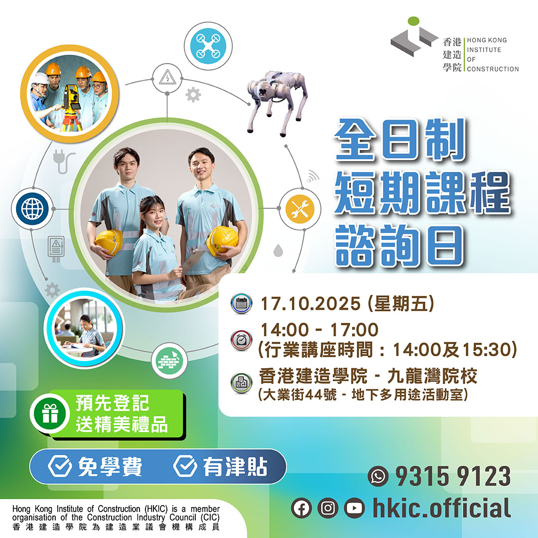 香港建造學院將於2025年10月17日舉行全日制短期課程諮詢日,課程適合待業或轉職人士報讀。課程免學費外,學生每月更可獲高達$12,910*訓練津貼,畢業後亦可透過學院提供的就業支援服務獲得職業配對及就業機會。