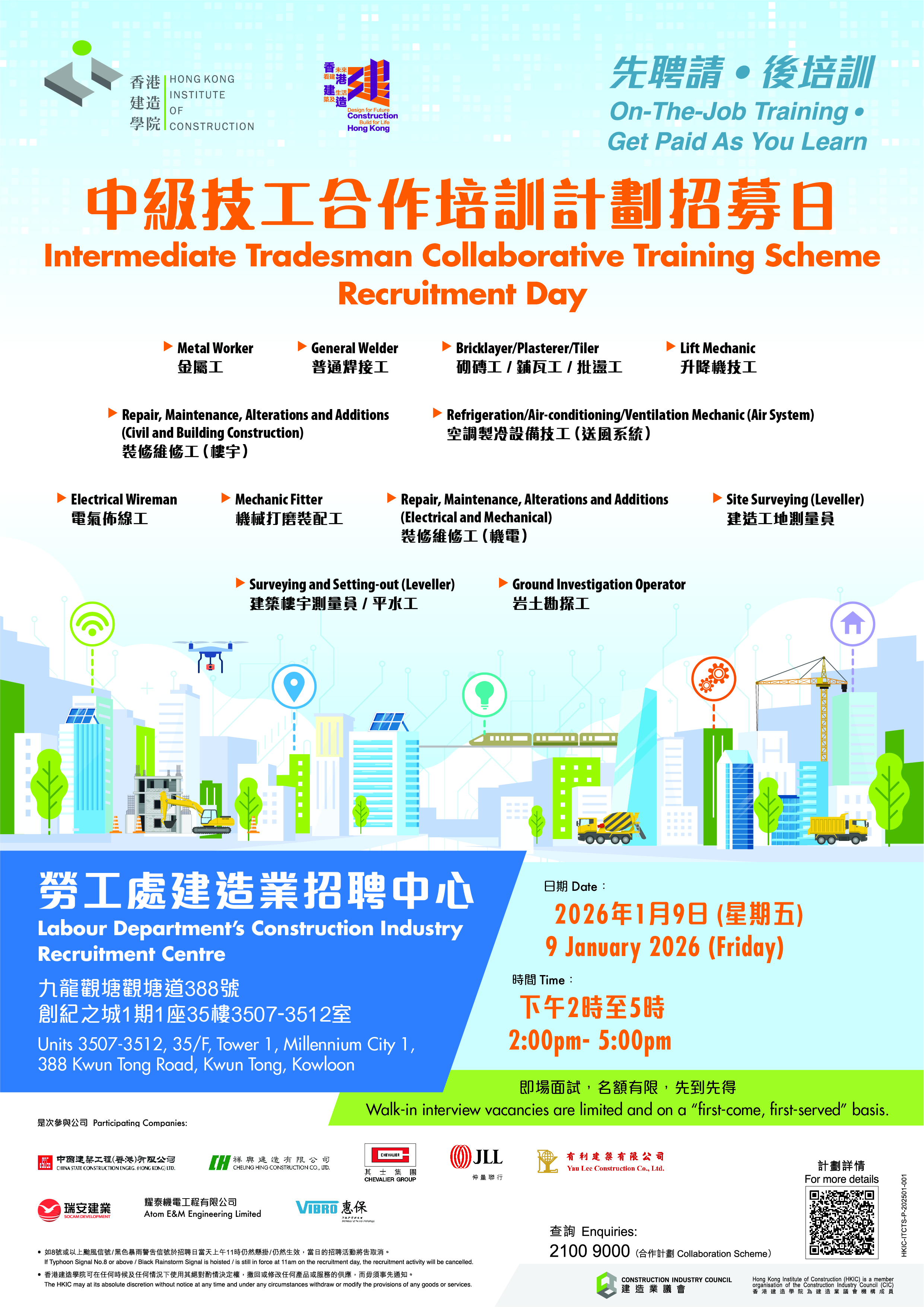 地點:觀塘勞工處建造業招聘中心(九龍觀塘觀塘道388號創紀之城1期1座35樓3507-3512室 )